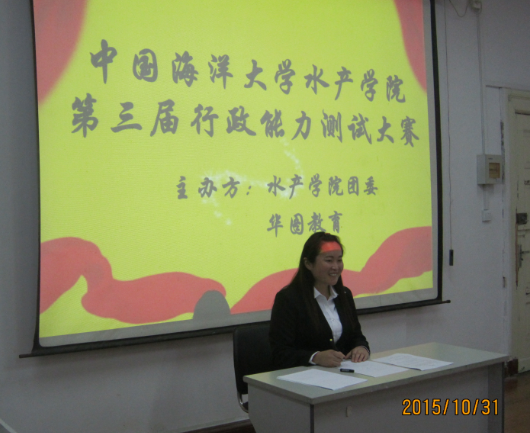 本站讯 2015年10月31日14:00时,中国海洋大学水产学院于档案馆养殖多媒体举行第三届行政能力测试大赛复赛,即面试考核环节。此次大赛由水产学院团委和华图教育共同举办,经过初赛选拔的来自鱼山校区的7名同学参加了此次复赛。